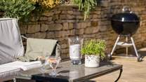 In the top garden, there's a gorgeous patio with another six-seater teak dining table for alfresco meals, a barbeque, plus seating, two sun loungers and a coffee table for further relaxation.